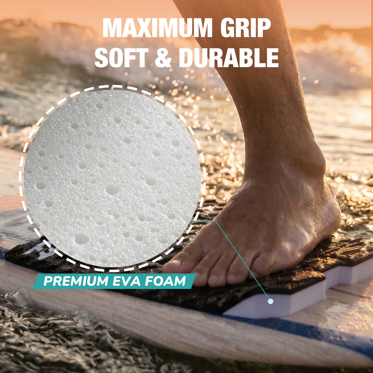 Recognizing that every quiver is unique, the modular three-piece design offers total versatility, allowing you to spread the pads wide for longboards or keep them narrow for shortboards, fish, and skimboards. To ensure this deck grip becomes a permanent part of your board, we’ve equipped it with the strongest industrial-grade 3M marine adhesive available. This "peel-and-stick" solution is built to withstand constant saltwater exposure and extreme temperatures, ensuring your traction pad stays locked to your board so you can surf with absolute confidence.