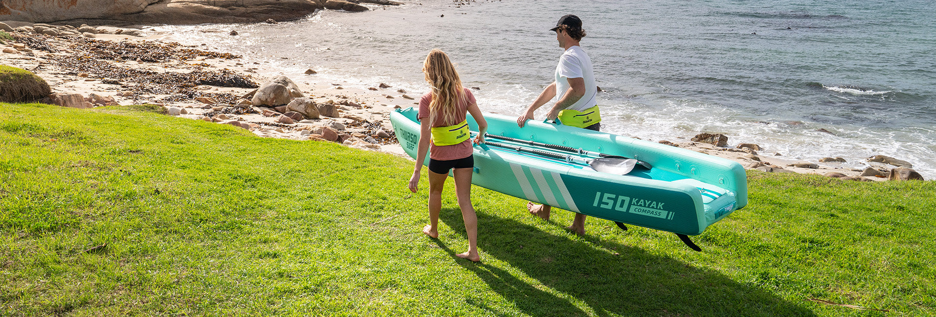 Due to their wider design, tandem kayaks are recommended for beginners who want to start their kayaking journey together. For paddlers who don't want to kayak alone, the 2 person kayak is a practical way to start kayaking. Kayak together with someone to build confidence and stability. Paddling with a partner makes it easier to paddle and navigate the waters. An inflatable tandem kayak is a popular choice for beginners as it's easy to store, transport and inflate. Bring along your life jackets, sunscreen, soft coolers and dry pouches to start your kayak journey!