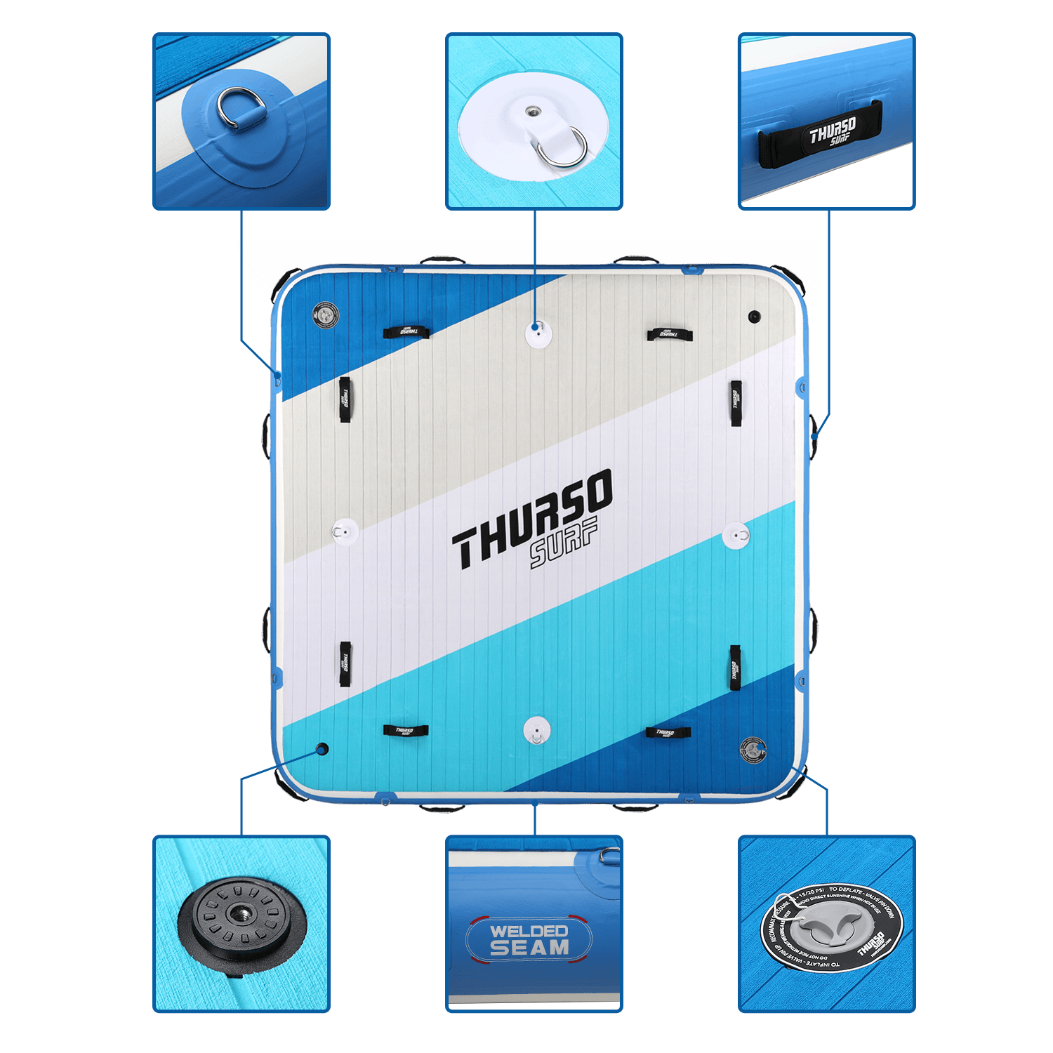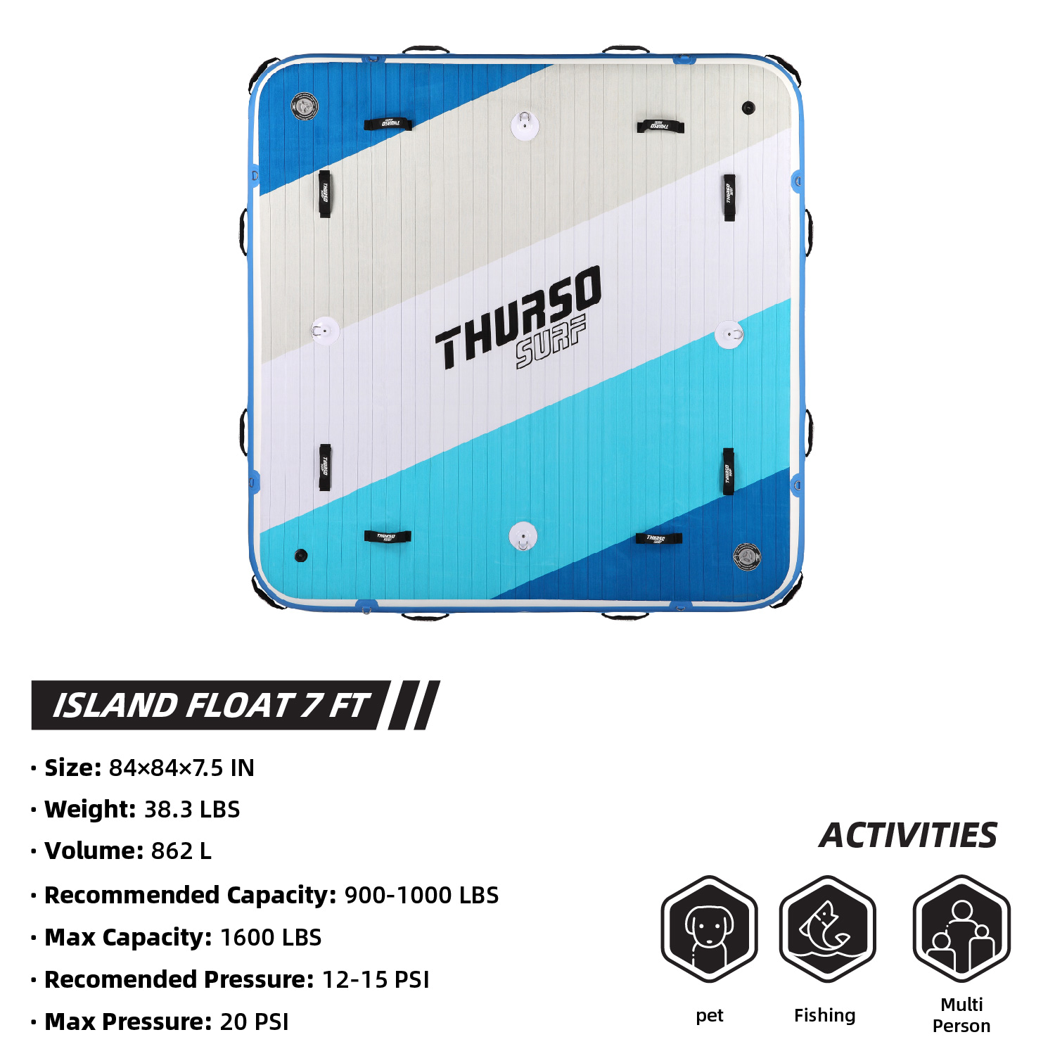 Con unas medidas de 7" x 7" x 7.5", la espaciosa cubierta cuadrada soporta varias personas o equipo pesado, ofreciendo un excelente equilibrio y flotabilidad incluso con hasta 1,000 lbs de peso (máximo 1,600 lbs). Ya sea amarrado junto a un bote, anclado en el lago o flotando cerca de la playa, esta plataforma se mantiene estable gracias a su construcción en PVC de grado militar y refuerzo de drop-stitch.