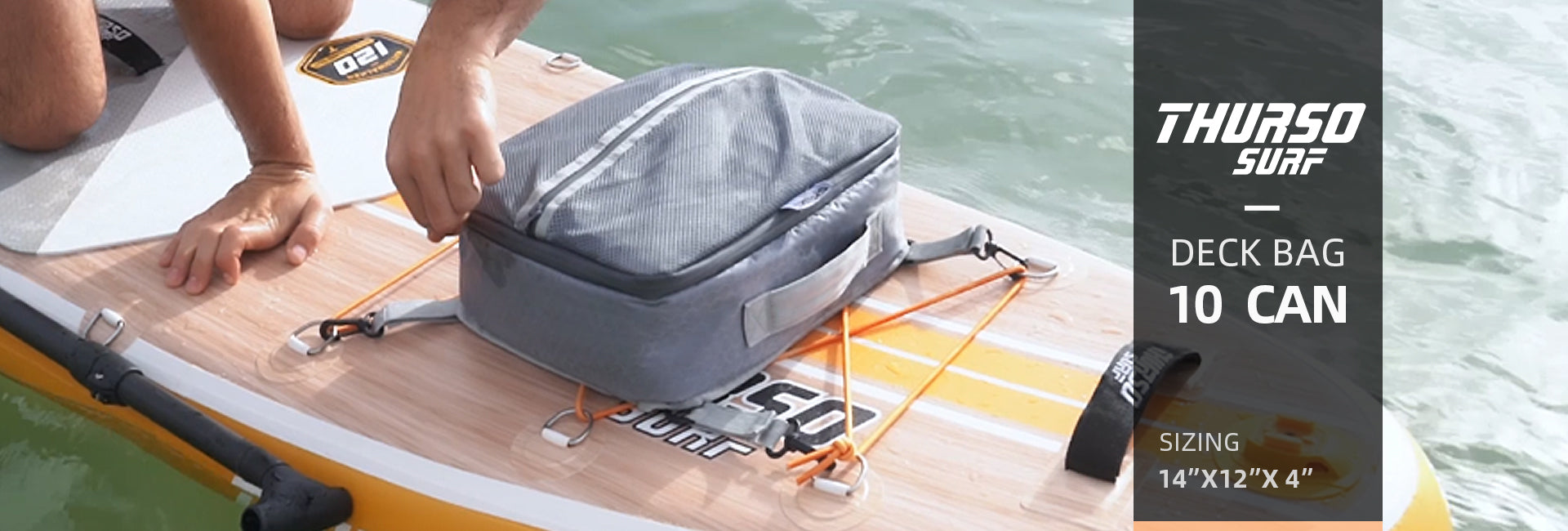 The paddle board deck bag comes with 4 velcro hooks to attach to D-rings on the deck. It can also be easily secured under the deck bungees. The handle on the side of the cooler allows easy carrying.