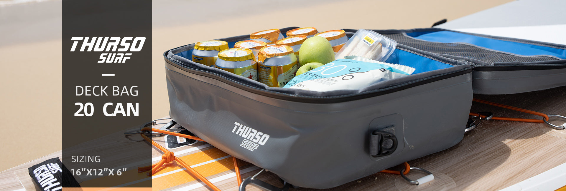The SUP deck bag measures 16” × 12” × 6” and can hold up to 20 cans or an equivalent amount of food, perfect for your multi-day excursions. Its high-quality, three-layer construction includes a PVC exterior and waterproof zipper to keep out excess water, a high-grade insulation cloth liner, and ultra-thick high-density foam for superior insulation.