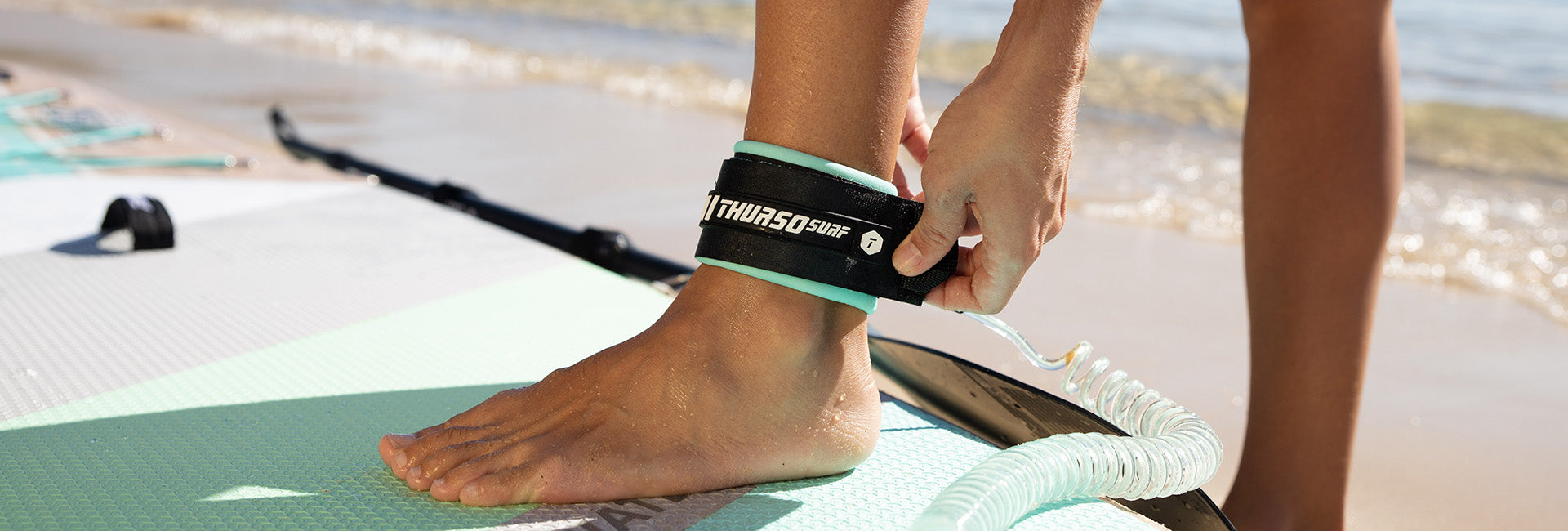 THURSO SURF 10 feet PRO coiled SUP leash features stainless steel double swivels, preventing your leash from tangling and wrapping around your legs. Whether you're paddling on calm lakes, surfing ocean waves, or exploring rivers, a paddle board leash ensures your board is always within reach while. A high-quality paddle board ankle strap should be part of every paddler’s gear setup